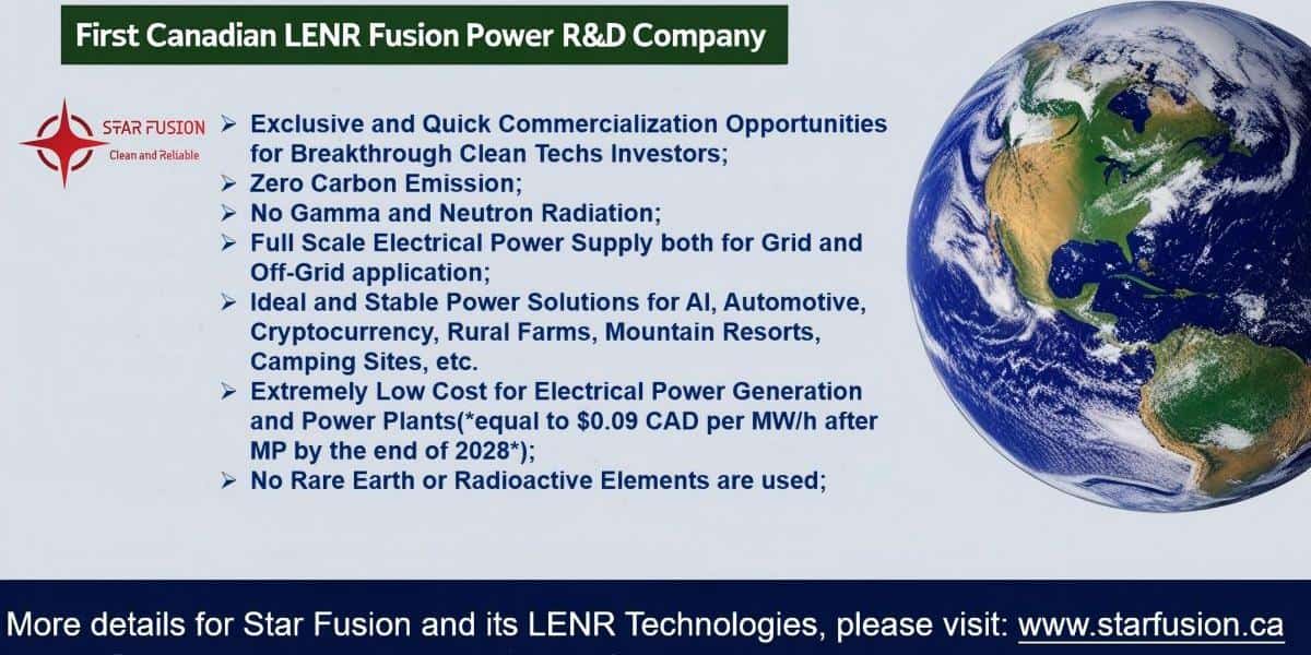 全球目前只有6家公司做冷核聚变,然而可以公开可以查到登记的只有3家公司,Star Fusion是加拿大唯一一家冷核聚变公司。The whole world now only have 6 top LENR companies ,France -1(not open to the public) UK-1(ENG8) Japan-1(日本水野,网上无公开信息)USA -1 (Brilliant Light Power) Russia(网上无公开信息 )Canada-1(Star Fusion Technologies,LTd) Star Fusion公司发展战略:2027年出5-50KW样机,公司估值15亿美元,2028年出1-2MW商业机,公司估值50亿美元-100亿美元,2029上市,公司估值200-300亿美元,2030年底出5GW以上商业机,公司估值500亿美元以上,低温核聚变最快的独角公司。日本水野公司2030商业化